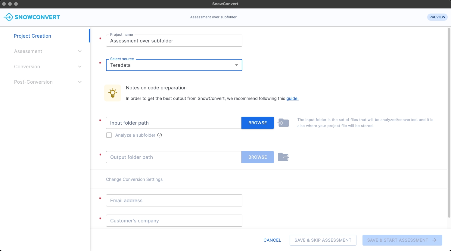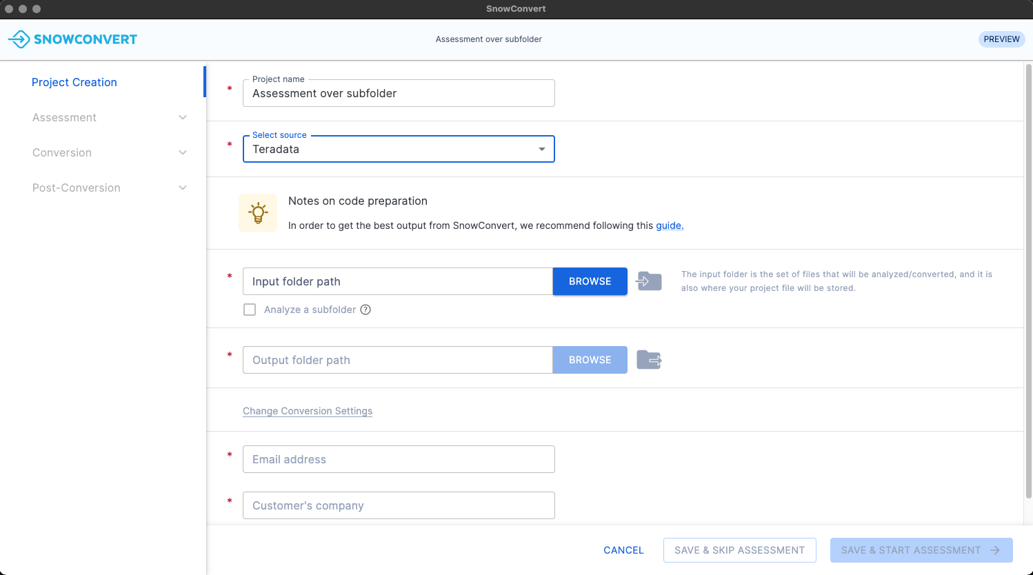 Now you can continue filling in the Email address and Customer's company fields and clicking on the Save & Start Assessment button. With this, the assessment process will be started using the selected subfolder as folder input.
