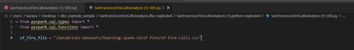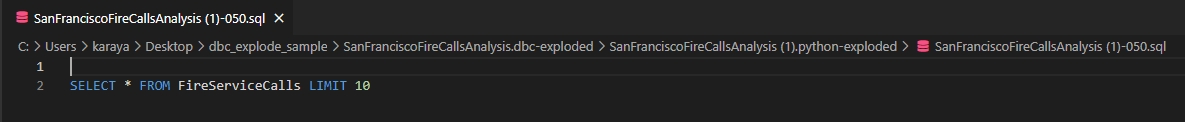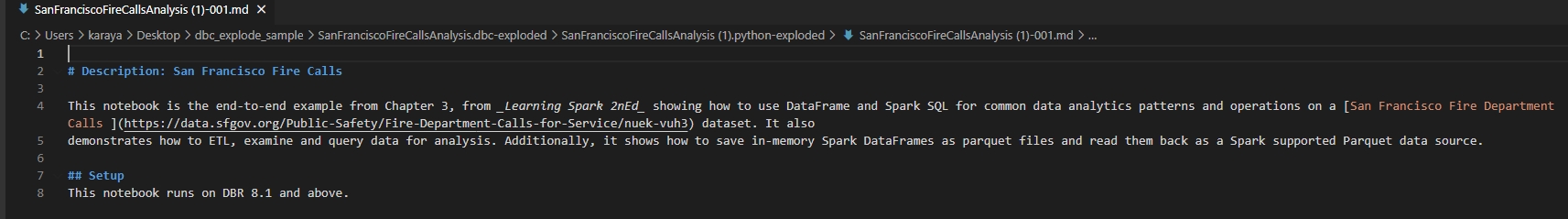 This folder will contain a folder for each notebook found on the .dbc file. In the sample above, the .dbc file has one notebook (SanFranciscoFireCallsAnalysis (1).python)