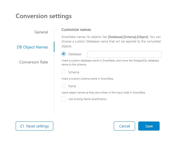 While not a separate page, the reset settings option appears on every page. If you've made changes, you can reset SnowConvert to its original settings. When you select this option, you will be prompted to reset the settings on only this page or every page in the configuration settings.