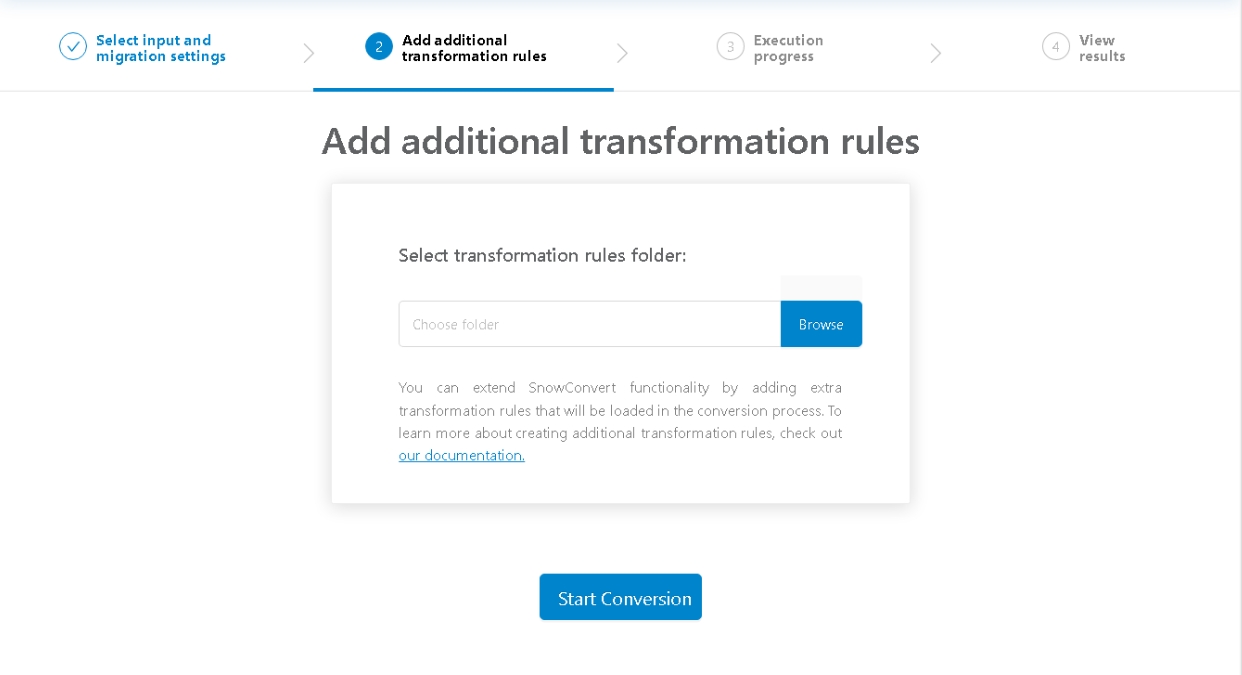 In this screen, you can optionally include additional translation rules that SnowConvert will dynamically load and execute at runtime. Via these extra rules, the functionality of SnowConvert can be extended and personalized to particular needs. There is a whole section of pages where the Extensibility in SnowConvert is explained, we recommend going through these docs to fully understand how to take advantage of this feature. If you're already a customer of Snowflake, reach out to your contact to get access to the full reference page.