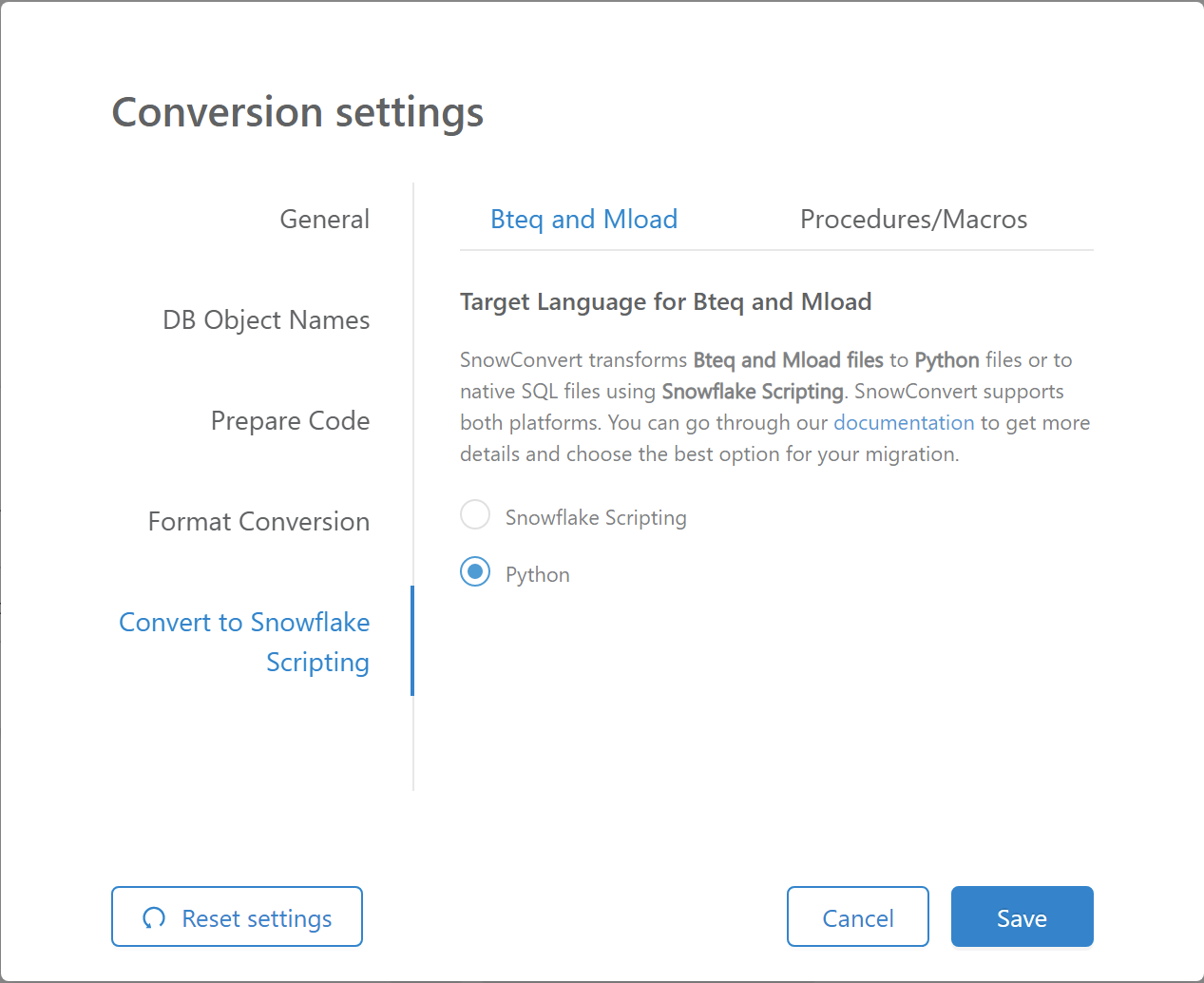 On this page, you can configure the target language you wish to translate your Bteq and Mload scripts. The two options currently available are Python and Snowflake Scripting. The default target language is Python.