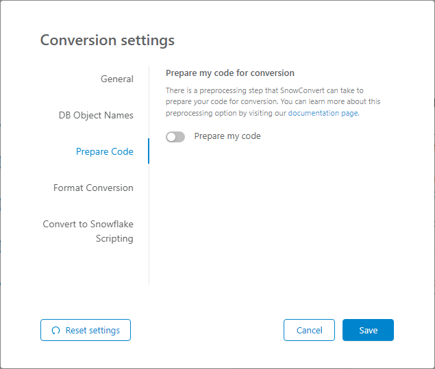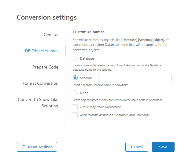 While not a separate page, the reset settings option appears on every page. If you've made changes, you can reset SnowConvert to its original settings. When you select this option, you will be prompted to reset the settings on only this page or every page in the configuration settings.