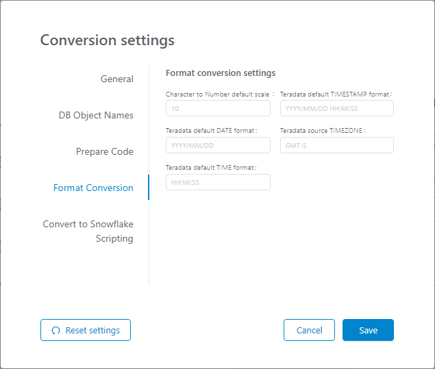 Format Conversion Settings: In Teradata, there is a feature of explicit cast conversion where one expression can be cast from one type to another type. For some explicit casting where the code doesn't indicate the format, Teradata uses default formats in order to parse the given cast value. However, some Teradata users may modify the default formats globally, so in this case, SnowConvert also provides you to specify those default formats.