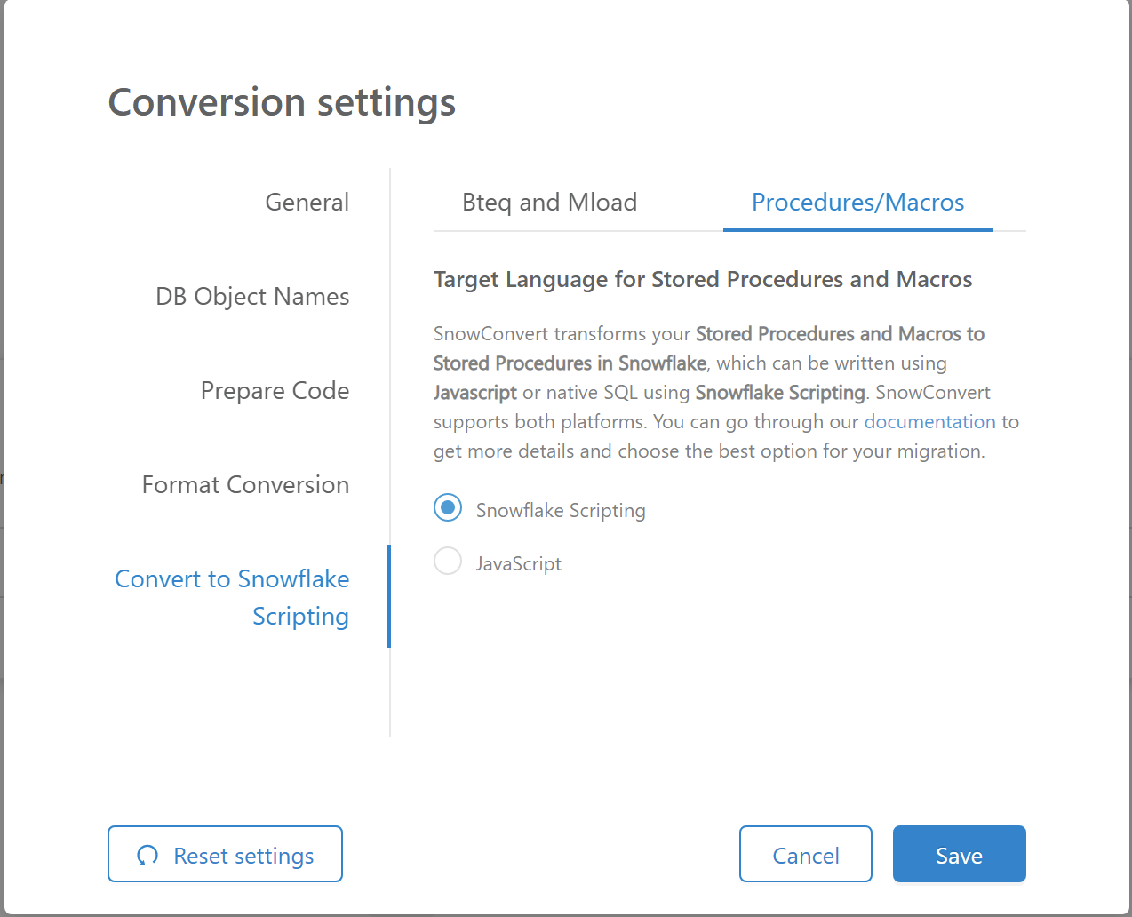 On this page, you can configure the target language you wish to translate your stored procedures and macros. The two options currently available are JavaScript and Snowflake Scripting. The default target language is Snowflake Scripting.