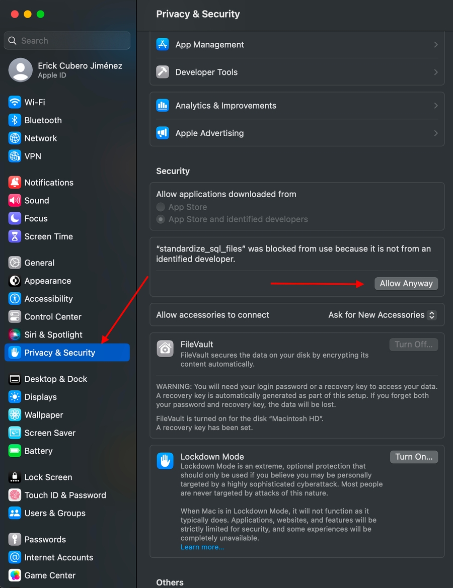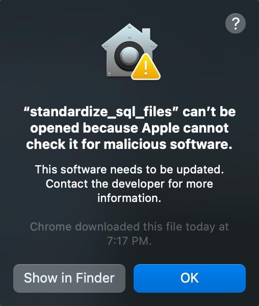 ./standardize_sql_filesIf this is the first time running the binary the following message will pop-up: