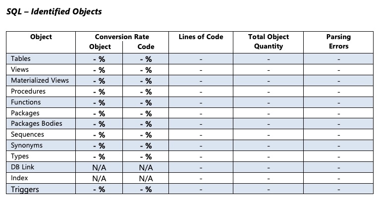 Represents the percentage of identified objects by SnowConvert that were successfully migrated. This will help to determine the number of objects that were successfully migrated and the objects that need manual work in order to complete the migration of the objects to Snowflake. If N/A is listed in the column, it means that the object type is not supported in Snowflake. A "-" could also be listed in this column, this means that the set of files migrated by SnowConvert did not contain objects of the specific type that could be identified.