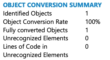 Explanation: In this example we have 3 statements, all of them have been identified as an object, but just the table1, and the view1 have a 100% conversion rate. The table3 has an error warning meaning that the conversion of this table is not 100%, that's why just 2 of the 3 statements are counted as fully converted objects.