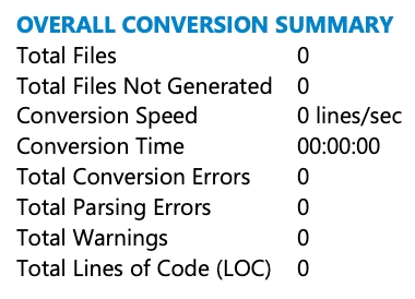 The total count of conversion errors that occurred during the conversion process. This type of error could be related to file I/O, memory management, or any abnormal situation that cannot be handled by SnowConvert. These are unhandled code exceptions and are considered critical issues.