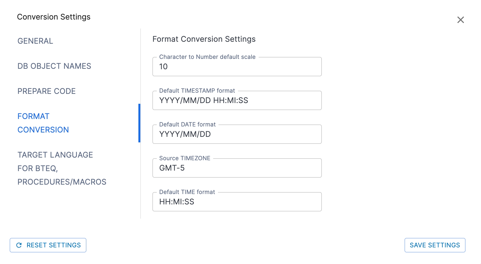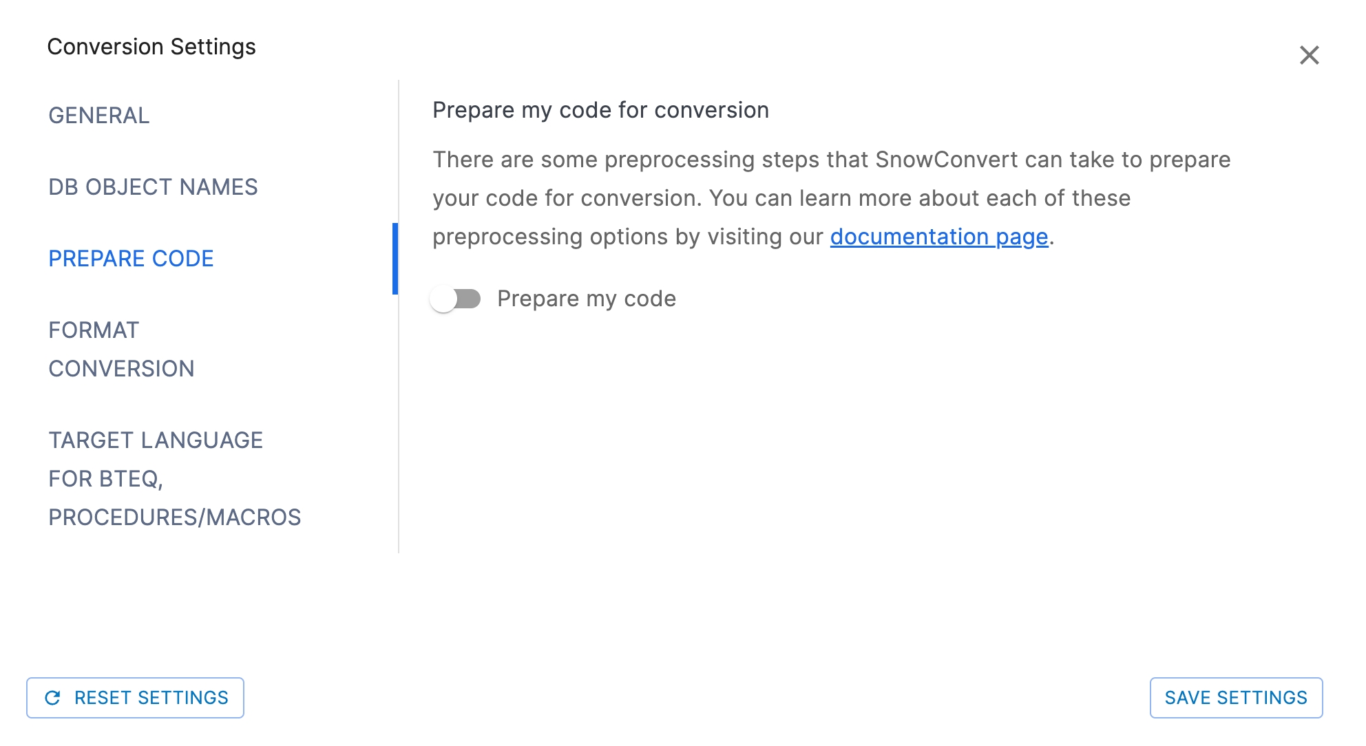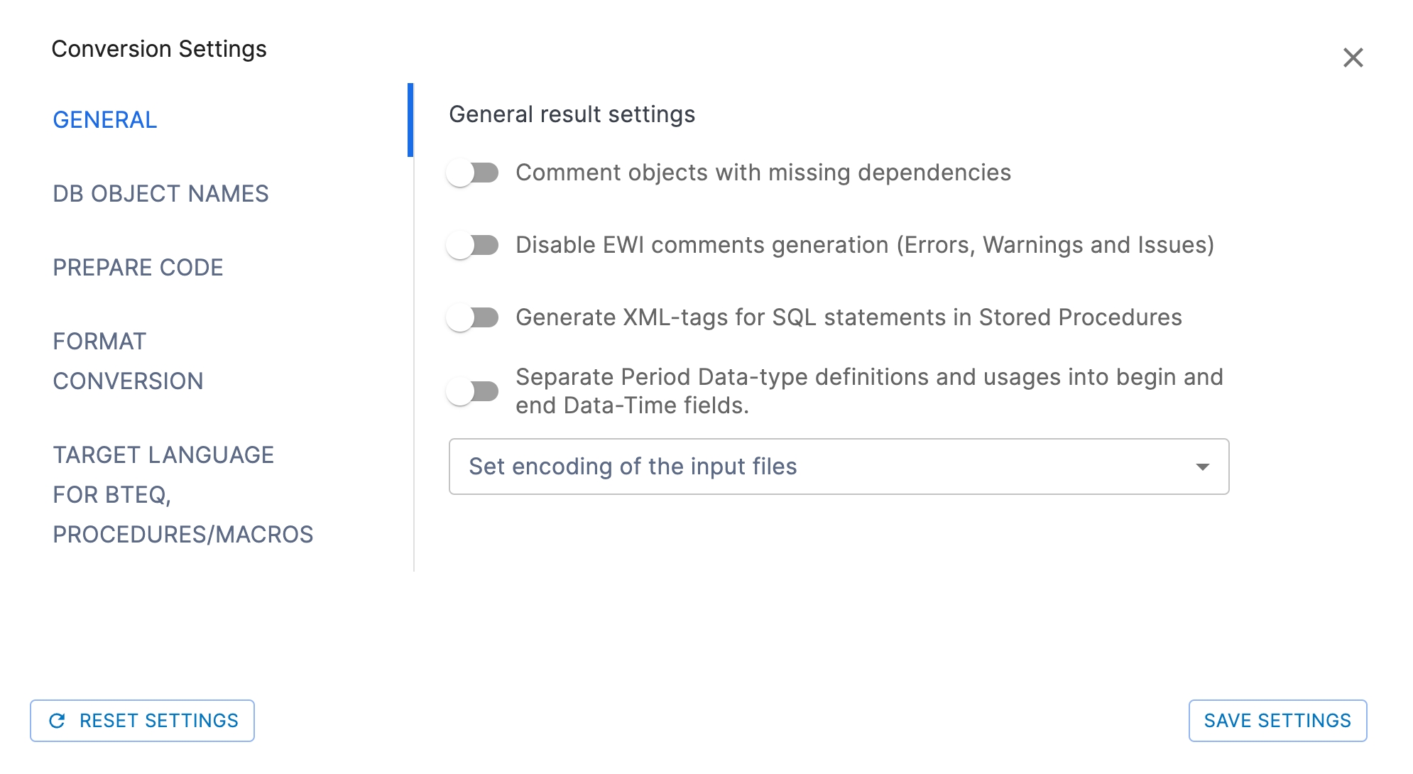 Reset Settings: The reset settings option appears on every page. If you've made changes, you can reset SnowConvert to its original default settings.
