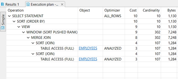 The following image shows the enhanced execution plan (implemented since Oracle 12c) for the test query:
